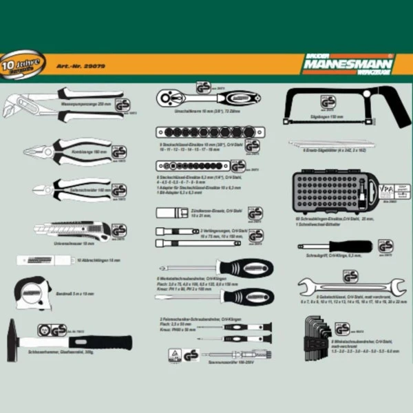 Robuuste aluminium gereedschapskoffer, gevuld met 133-delige set Green Line kwaliteitsgereedschap, voor professional en hobbyist. Zo krijg je onder andere diverse tangen, bits, doppen en nog veel meer in verschillende maten en uitvoeringen. Al het gereedschap heeft een eigen plek in de koffer zodat je die altijd snel kunt vinden.
