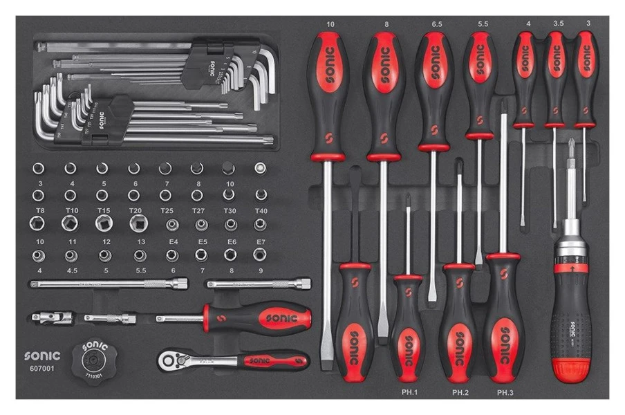 Goed gereedschap is belangrijk bij het klussen en deze veilig en goed opbergen is net zo belangrijk. Met deze Sonic Next S8 haal je een hoogwaardige gereedschapswagen in huis die is voorzien van een 197-delig gereedschap. Hieronder bevinden zich diverse sleutels, doppen, hamers, tangen, beitels en nog veel meer in verschillende soort en maten. Allemaal handig en overzichtelijk opgeborgen in flexibele en stevige inlays die zijn verdeeld over de laden. De gereedschapswagen is compact en makkelijk te verplaatsen door de vier heavy duty zwenkwielen, waarvan er twee voorzien zijn van een rem, Het afneembare bovenblad is gemaakt van RVS en de wagen is voorzien van een spuitbus- en papierrolhouder.